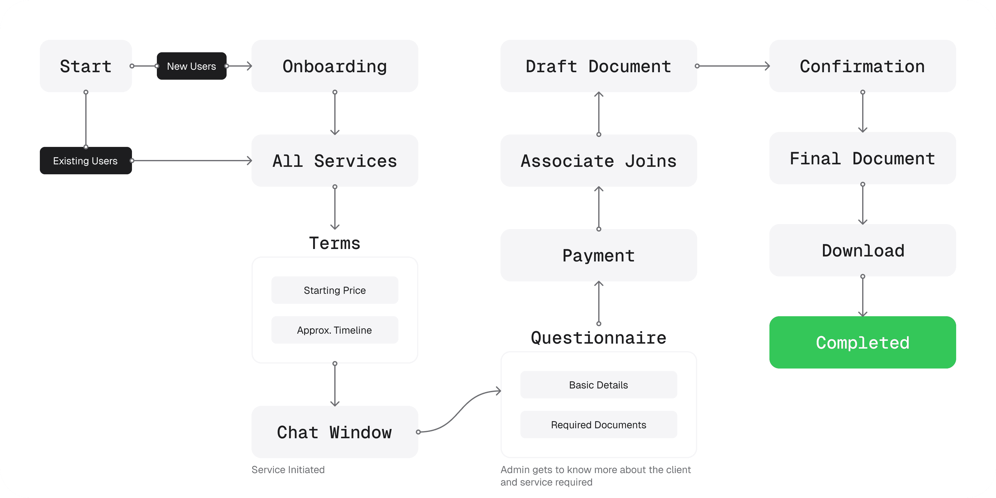 As a product designer I was responsible for defining the end-to-end experience across client, associate, and admin flows. My role included research, UX strategy, wireframing, interaction design, and usability validation. I closely collaborated with engineering team to ensure the product balanced user needs with real-world legal and operational constraints.