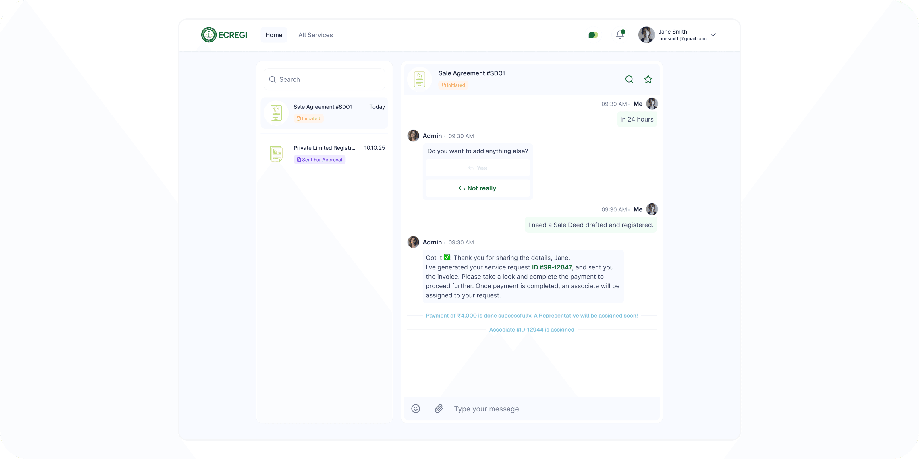 ECREGI was built to simplify how individuals and businesses handle legal documentation, registrations, and compliance in India. Most people struggle with unclear processes, offline dependencies, and lack of visibility. The goal was to create a single digital platform where users could request services, communicate with professionals, upload documents, make payments, and track progress without confusion or repeated follow-ups.