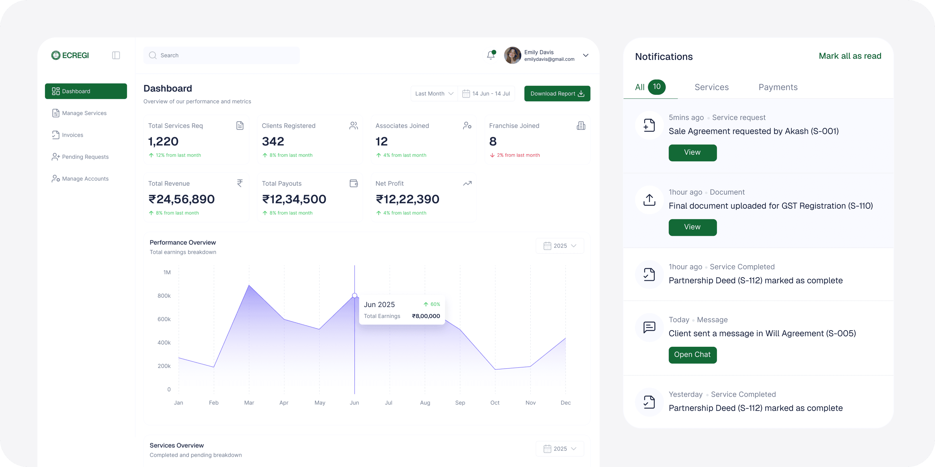 The admin dashboard provides a real-time view of services, users, payments, and performance. Admins can assign associates, track workload, approve accounts, and export reports. This central control reduces manual coordination and supports smooth day-to-day operations.