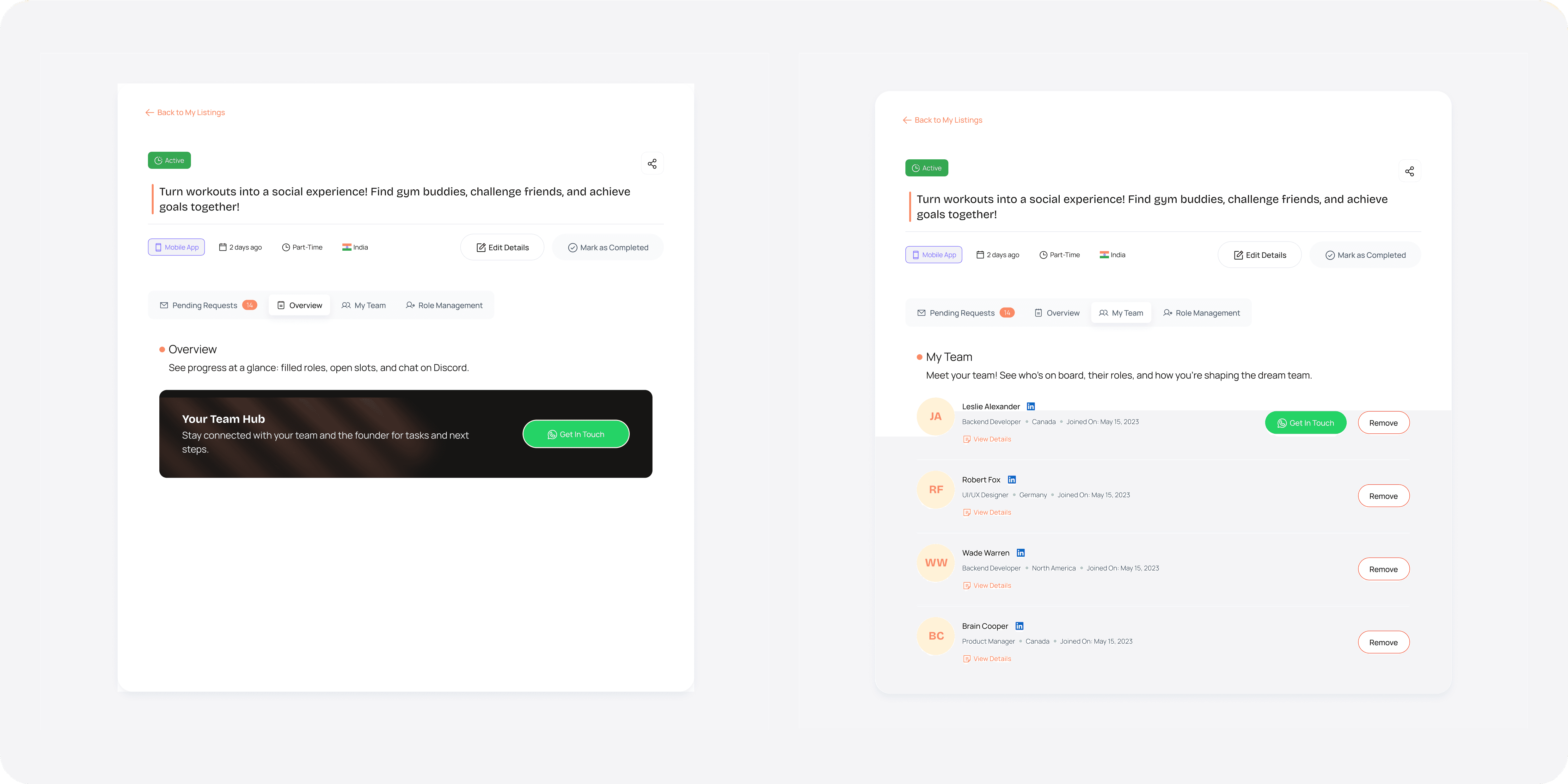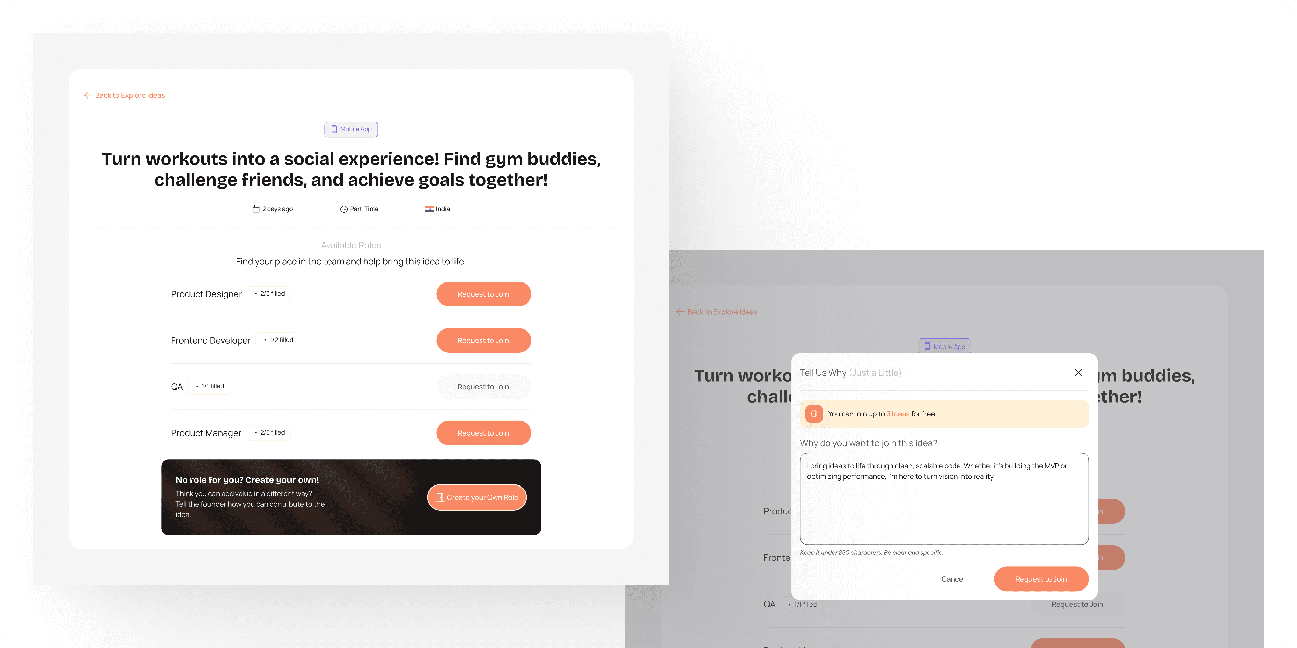 Idea owners often had clarity on what they wanted to build but not on who to involve or how to invite collaboration. People looking to join projects found it hard to understand expectations, team commitment, or how they could contribute meaningfully. Both sides lacked a clear, low pressure way to start working together with shared context.